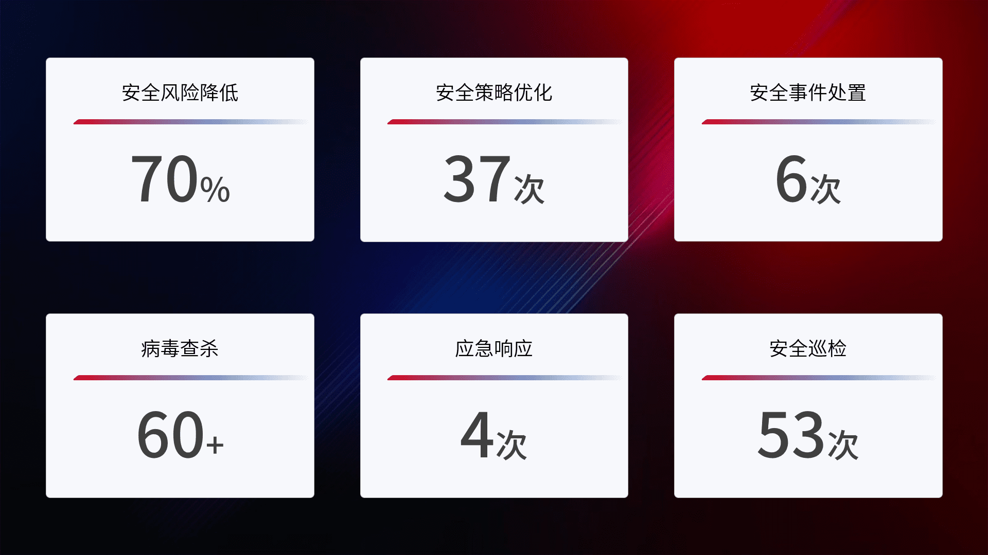 提供全面的安全事件报告体系,,,,包括处置报告、、、、周报、、、季度和年度总结,,结合持续监控,,,,帮助客户深入了解网络安全状况。。