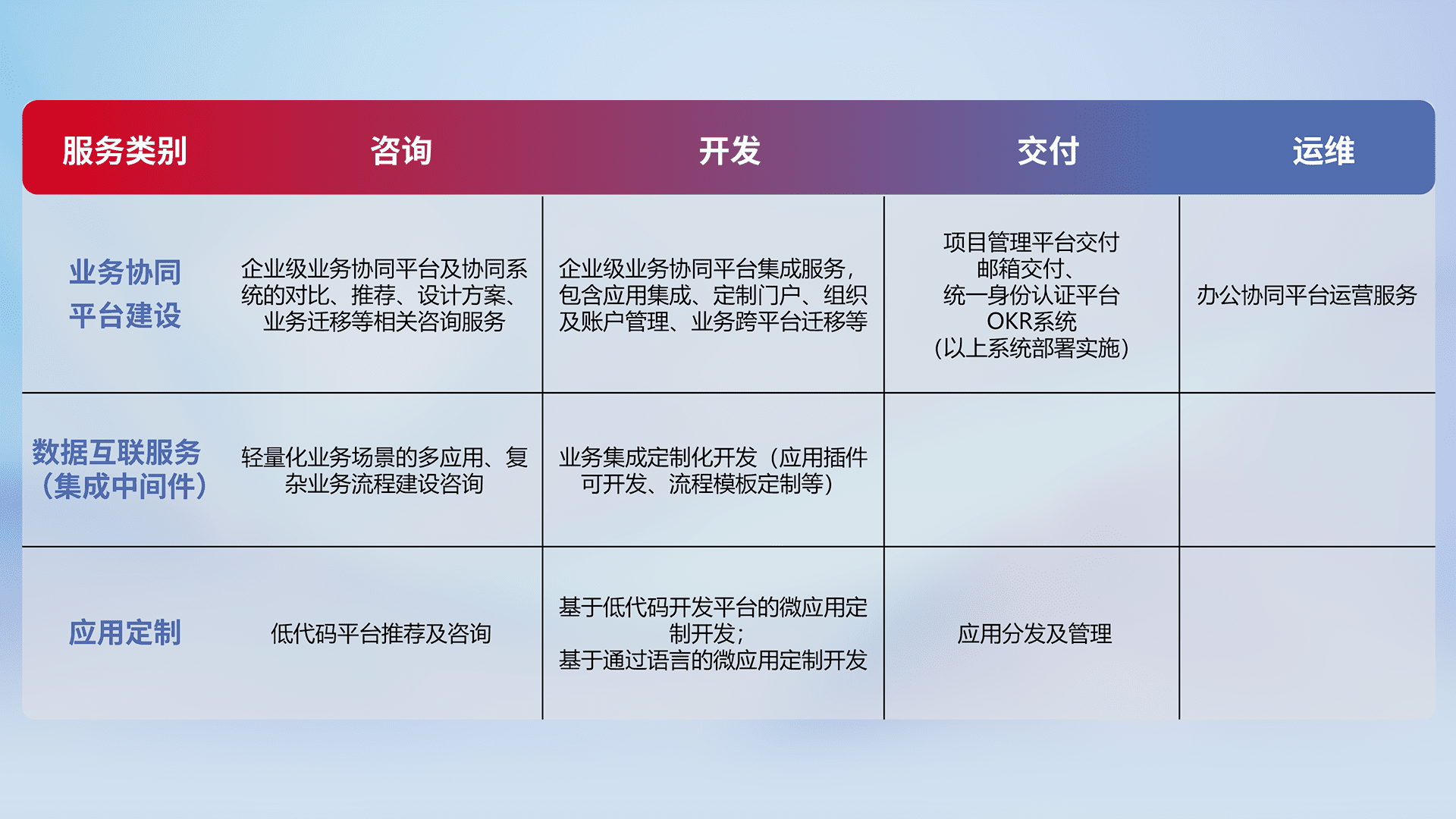 针对钉钉、、、、企微、、、、IDaas等平台级产品提供产品的规划、、方案、、、交付、、、、定制化开发等服务,,,实现如统一协同办公、、智能客户服务、、、、混合会议管理、、智能数据查询、、、、等业务场景,,实现数字化转型。。。。
