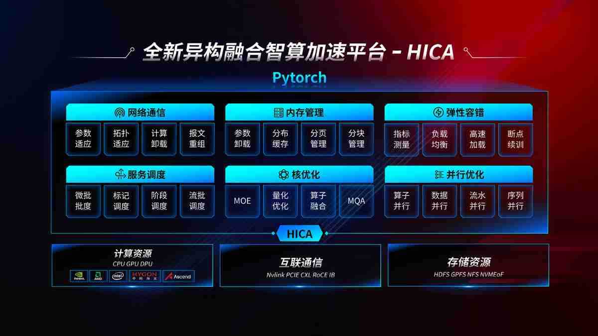 通过自研的服务层、、中间适配层、、以及调度编排算法,,,采用数据并行、、、、模型并行等多种并行方式,,,,把并行计算任务进行有效的分解,,,,使其分别由相应的软件栈和算力资源来承接。。当GPU资源变化,,,,HICA可以实时动态调度计算子任务并调整模型拓扑和架构,,,以充分聚合各种算力资源。。